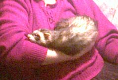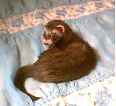 Kathy ist eine von 5 Iltisfähen die bei uns am 1.12.02 abgegeben worden sind, weil der "Züchter" keine Interessenten fand. Sie sind im August in Dresden geboren worden, als "Ausversehenwurf" ! Alle hatten Parasiten und waren schlecht ernährt, aber das werden sie alle sehr schnell nachholen. Kathi ist die dunkelste und kleinste im Wurf, aber auch die aktivste!